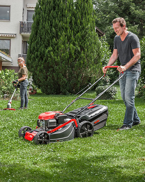 The single-speed wheel drive and the XXL lightweight wheels guarantee easy progress in the garden. The 4 IN ONE function offers the mowing, catching, mulching and side discharge of the lawn. The ergonomically shaped handlebar increases comfort when working. The grass clippings pass through the extra-high sheet steel deck with MaxAirflow technology to the rear and into the 70 l large grass box with level indicator, which is filled up to the top and thus needs to be emptied less frequently.