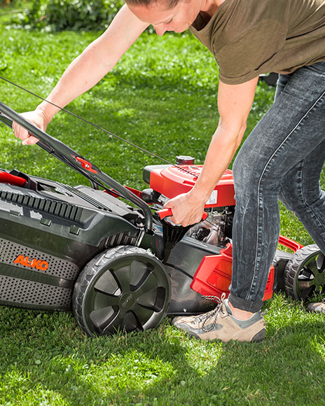 AL-KO Premium 474 SP-H Petrol Lawnmower With a cutting width of 46 cm, the 474 SP-H Premium petrol lawn mower ensures easy progress in medium-sized gardens (up to 1100 m²). The cutting height adjustment is carried out centrally in 7 stages from 30 mm to 80 mm. With a Honda AK123060 engine with overhead valves offer excellent efficiency, resulting in more power and less fuel consumption.