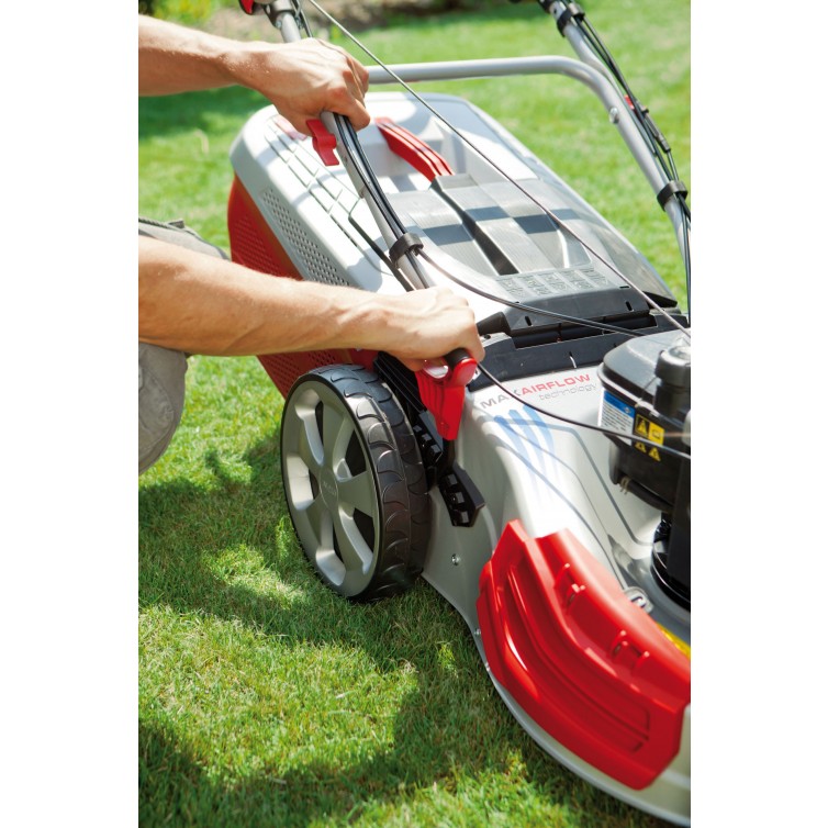 The variable speed wheel drive which allows the user to set the drive speed to suit their walking pace or mowing conditions, combines the XXL lightweight wheels to ensure that it's easy to move the mower around the garden, even if there are slopes. The 4INONE function offers mowing, collecting, mulching and side discharge of the grass. The ergonomically shaped, soft grip handlebar and the optimal cockpit with easy-to-reach controls and the pleasant soft grip handlebar make lawn mowing a pleasure.