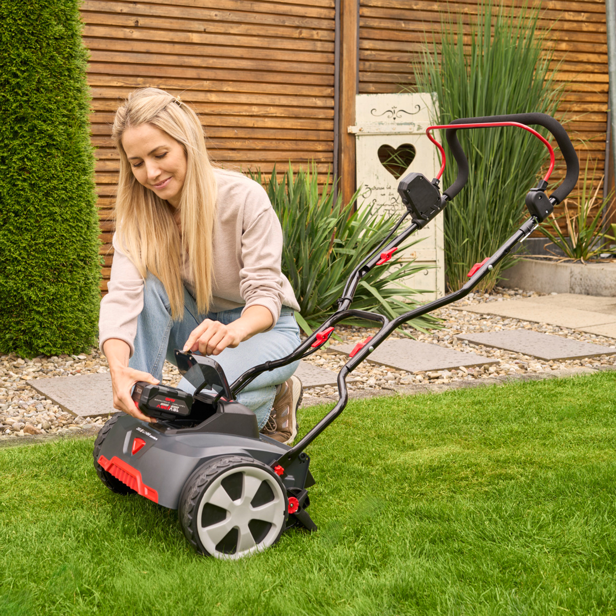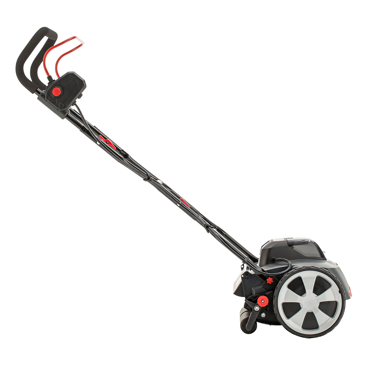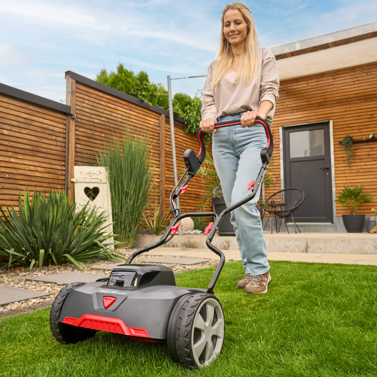 With a 38 cm cutting width and large 220 mm wheels, the RazorCut 38.6 Li offers excellent traction and smooth manoeuvrability across your lawn. Its high-quality blades ensure efficient cutting, while the quiet operation makes mowing a pleasant experience ideal for residential areas.