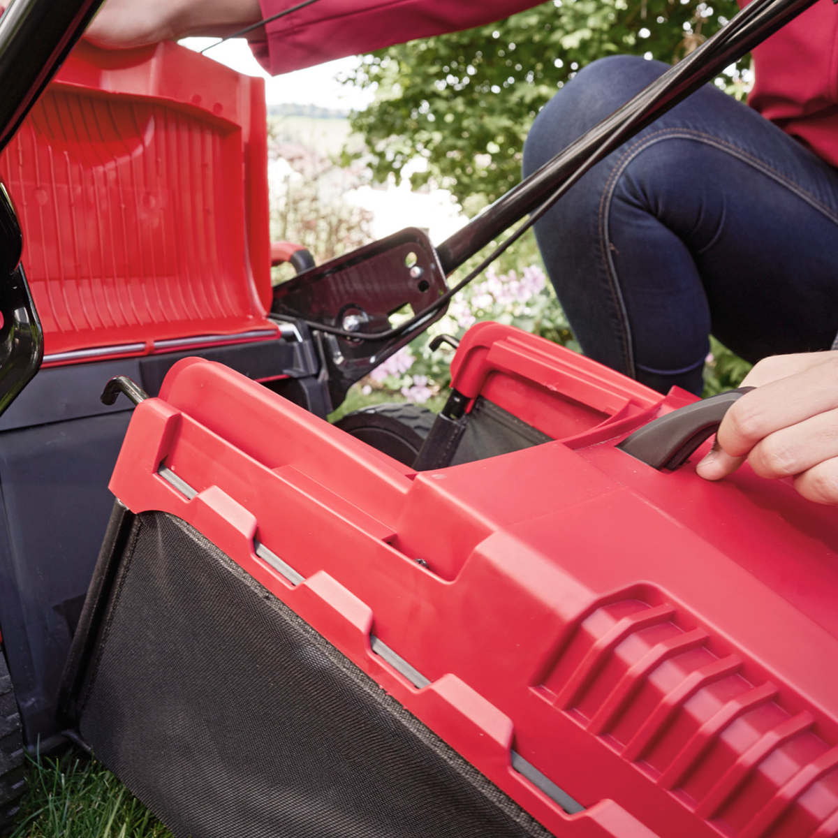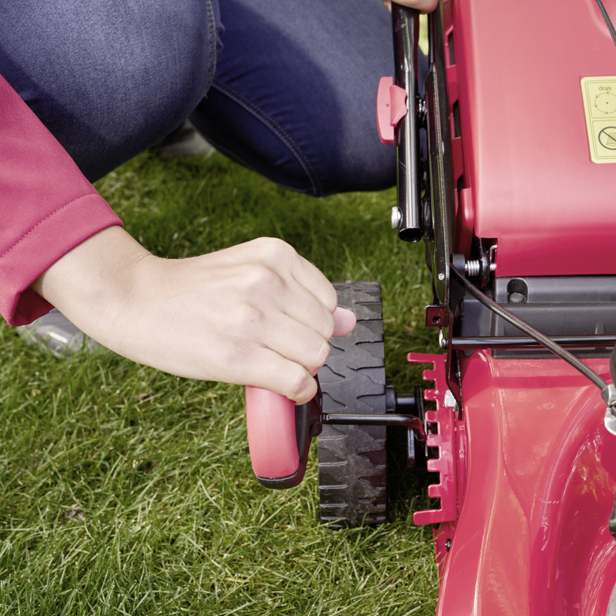 The comfortable cutting height adjustment enables the mower to cut at seven different heights between 25 - 75mm. The cutting height be can conveniently and centrally changed with a single hand movement.