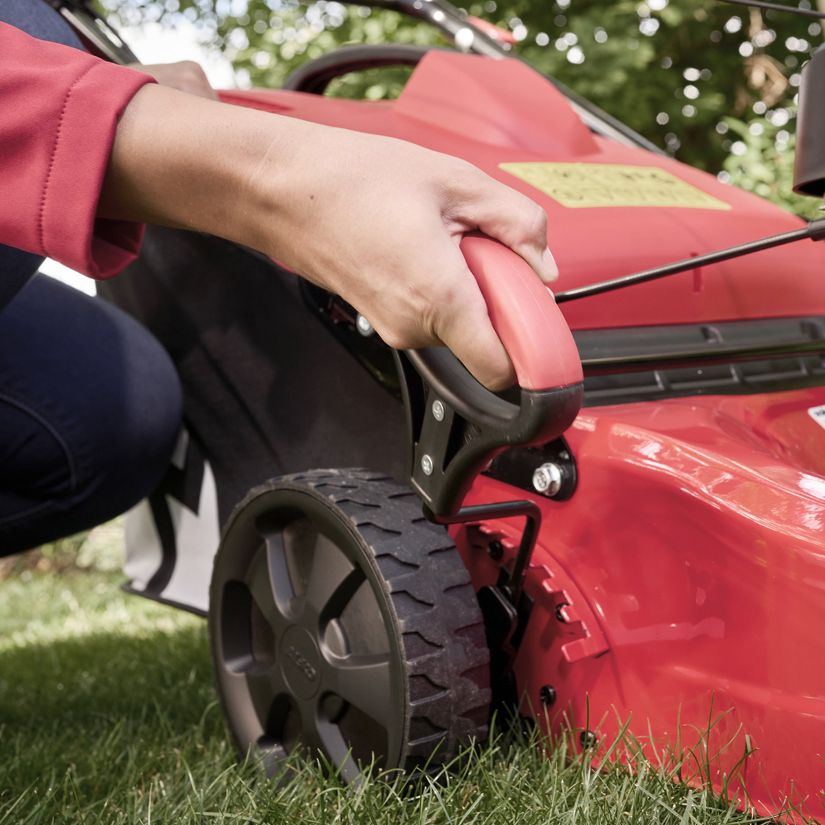 The comfortable cutting height adjustment enables the mower to cut at seven different heights between 25 - 75mm. The cutting height be can conveniently and centrally changed with a single hand movement.