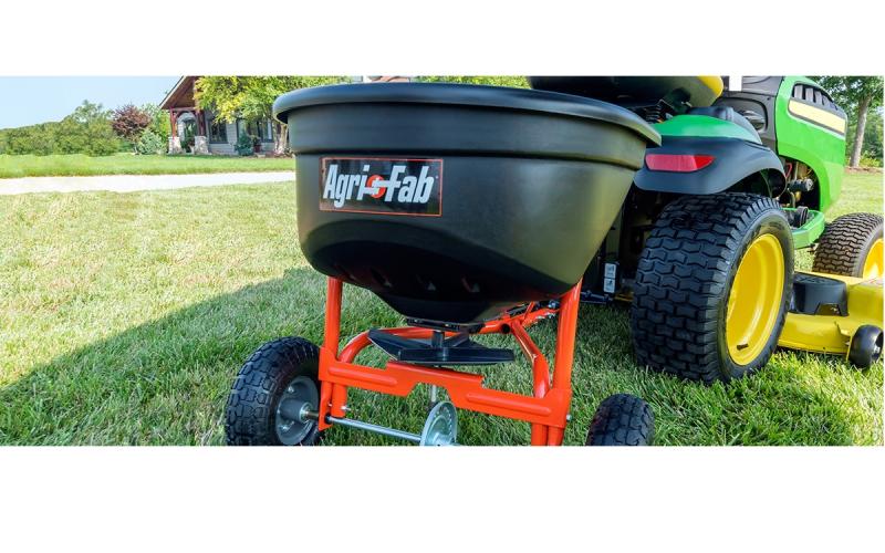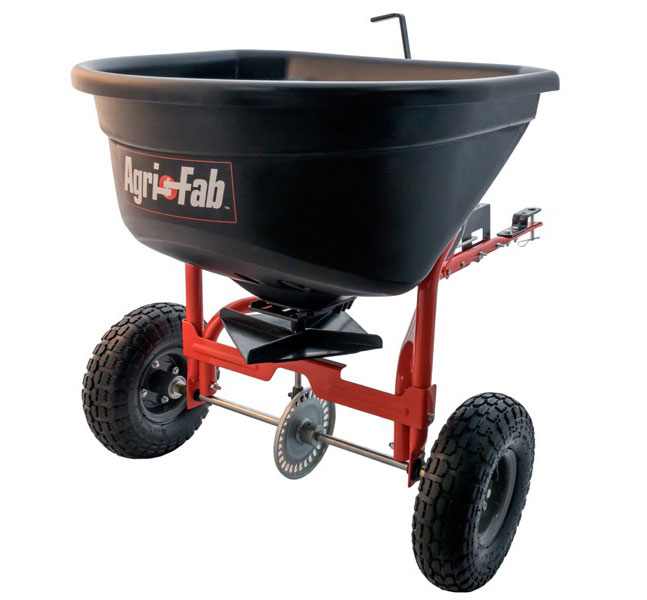 Agri-Fab AF45-0527 50kg Towed Broadcast Spreader This towed spreader is a good choice when you need to start, re-start or weed and feed your lawn, spread everything from fertilizer to seed to ice melt with this spreader. Solid construction and reliable design ensure even and continuous flow and spread of materials, eliminating streaks. Its large 10 ft. spread covers approximately 17,500 sq. ft., so you can cover more ground in much less time quickly and efficiently.