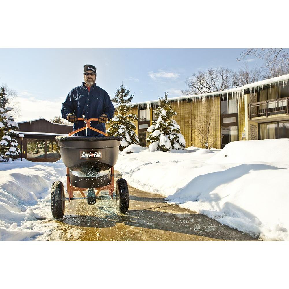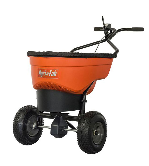 Agri-Fab AF45-0502 59kg Pro Push Broadcast Spreader The Agri-Fab, Inc. 130 lb. Commercial Push Spreader will help you fight the sleet, snow, ice, and cold that winter brings. Spreading rock salt and ice melt will be a quick and easy process in the harsh and cold winters thanks to the 130 lb. Commercial Spreader. A hopper cover, grate and deflector are included to keep the material dry and to narrow the spreading pattern to prevent unwanted material from being applied onto your lawn.