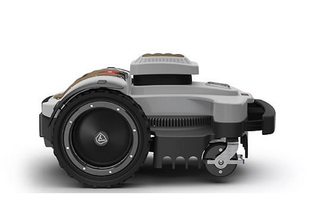 The most unique feature of Ambrogio NEXT Line 4.0 robots is their jointed body that allows the robot to conform to the shape of the ground. The joint is between the deck and the drive wheels. It tilts side-to-side, preventing scalping of the grass on uneven terrain.