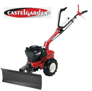 The Castel Tellus P55 Multifunctional unit with Snow Plough Fitted. Powered by the reliable Honda a GCV160 easy start 4 stroke engine engine. Featuring 2 forward and 1 reverse speeds. It can be used to power various dirrerent attachments as well as the snow plough. Reversible handle and adjustable height are standard features. This strong steel 85cm blade, now with a rubber lip can be angle to push left, right or forwards. Good tracton is attained with the chevron tyres. This machine is ideal for footpaths and walk ways, also for carparks and driveways. Simple and effective to use, this is the ideal tool for snow clearance this winter.