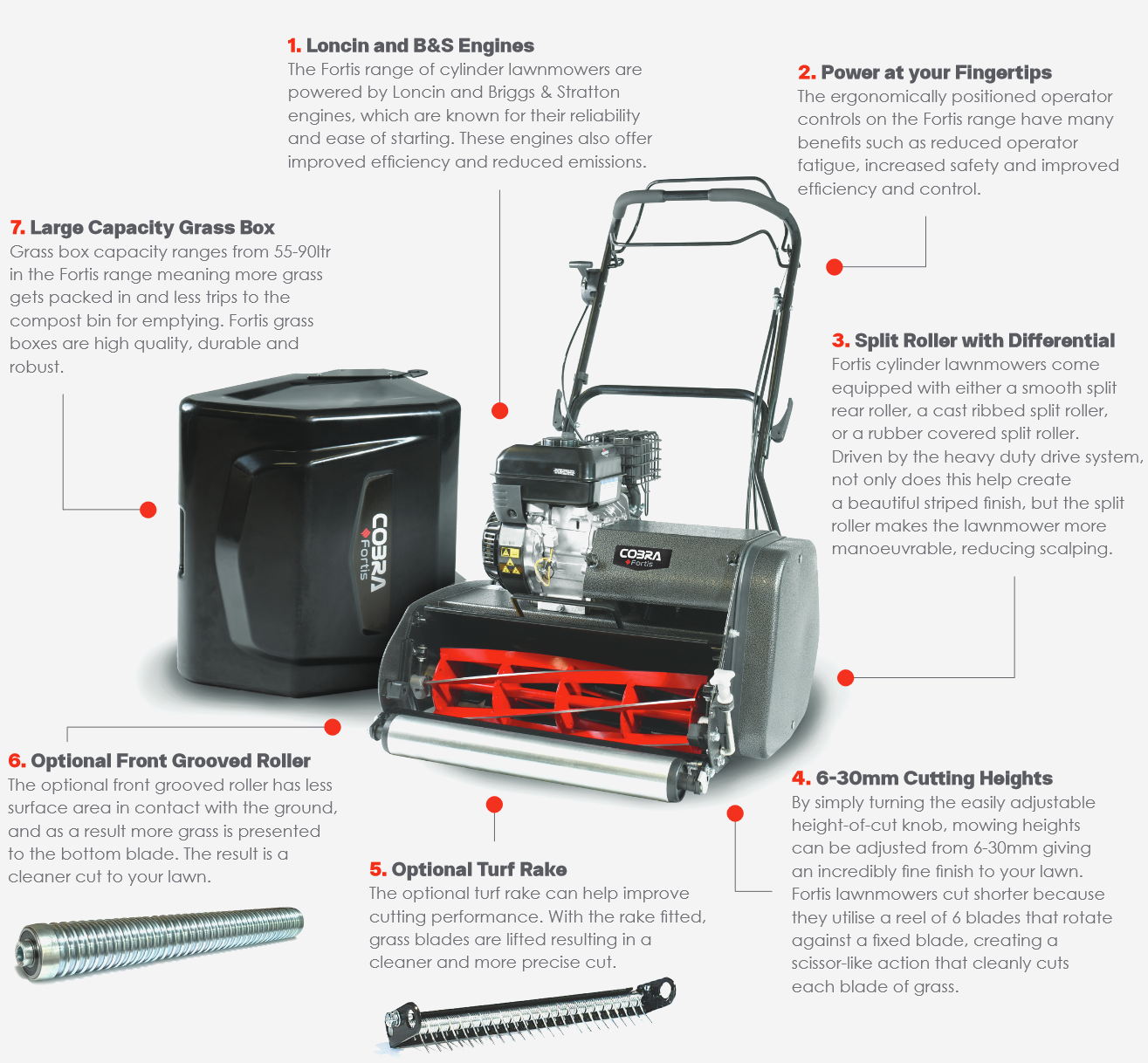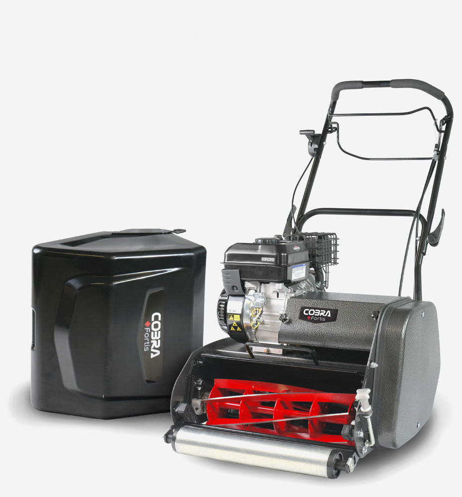 Cobra Fortis 17B Petrol Cylinder Lawnmower 43cm from the UK based lawnmower manufacturer Cobra. The superb combination of advanced lawn mower technology and a number of special features give the Cobra Fortis an unbeatable cutting performance.