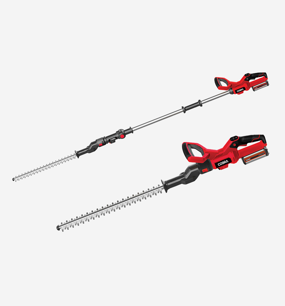 Cobra HT50LRH24V Cordless LI-ion Long Reach HedgetrimmerThe Cobra HT50LRH24V is a versatile 2-in-1 cordless hedgetrimmer that can function as either a standard hedgetrimmer, or a long reach hedgetrimmer. It has a 50cm double sided blade with a tooth spacing of 20mm and comes with a 24v Li-ion battery that offers Eco and Turbo settings for complete operator control.