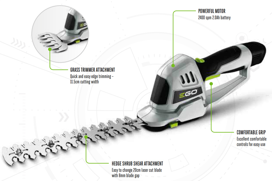 Ego Power+ CHT2001E Cordless Shrub / Grass Shears hey may be compact, but they dont compromise on power. Brought to life by a 12V Lithium Ion battery, the EGO Power+ shrub/grass shears are ideal for everyday garden maintenance.