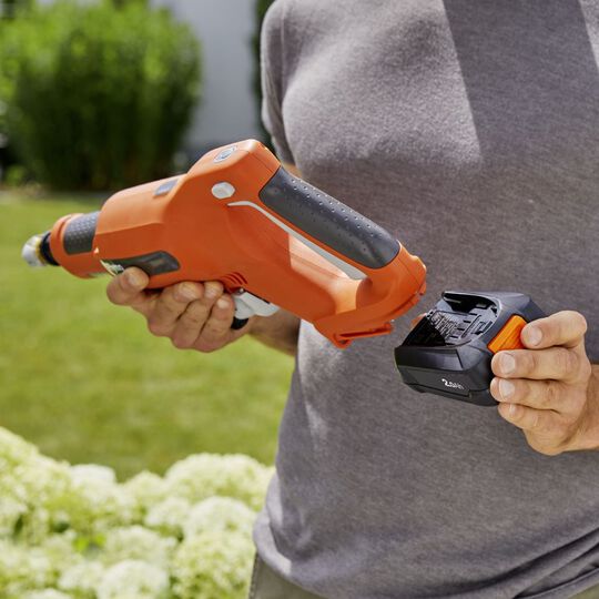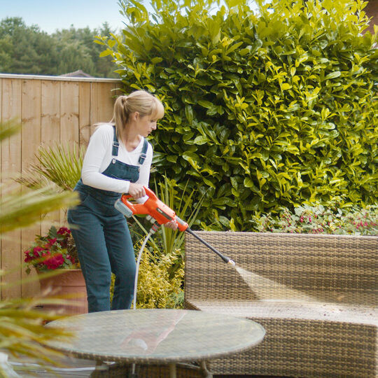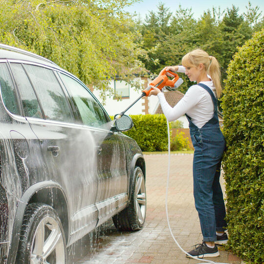 Easy to use and complete with 3 nozzles; long and short lances, water filter for use in outdoor water sources and 5m hose. The powerful battery delivers up to 31 minutes of cleaning and the LED display shows the life of the battery so you know when its nearly ready to charge.