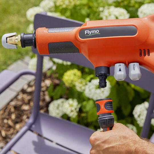 Flymo EasiClean 18V Cordless Pressure Washer Enjoy great cleaning power with Flymos new low pressure cleaner, with the added benefit of no mains cables. Flymos battery operated EasiClean enables you to clean around the home as well as out and about. Perfect for use when out camping, mountain biking as well as cleaning the car, windows, and outside furniture. The EasiClean can be used by attaching to an outside tap or simply with a bucket of water