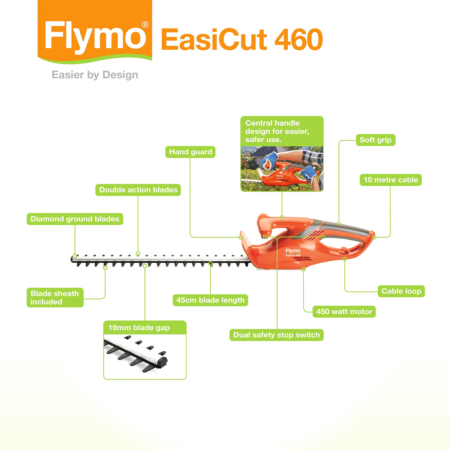 Flymo EasiCut 460 Electric Hedgetrimmer The EasiCut 460 is a powerful Electric Hedge Trimmer designed for easy and comfortable trimming of hedges and bushes big or small. Equipped with a 450W motor and 45cm dual-action cutting blade with a 19mm gap for an excellent performance. Its double-action blades help to provide a cleaner, neater, tidier cut to your hedge.