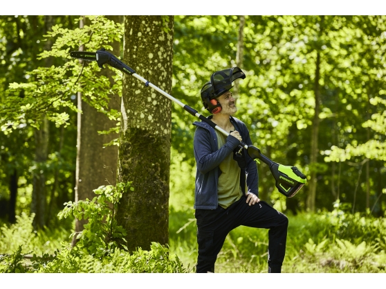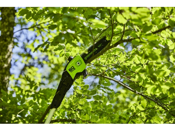 The Greenworks GD60PS25 is a high performance 60V pole saw designed for pruning high branches, at 2.8m in length the machine can easily cut branches up to 3m high without compromising on safety. Powered by an advanced 60V lithium-ion battery the machine offers impressive performance and long runtimes, making it a true petrol alternative, without the emissions, vibration, or noise.