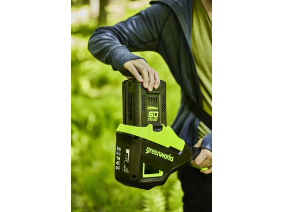 Greenworks 60V Lithium-Ion Battery delivers fade-free power with no memory loss after charging. 45 minutes full charge time & an 80% charge taking only 25 minutes. Complete with an LED Fuel indicator, you always know how much power you have left.