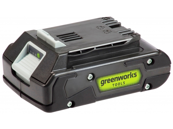 Greenworks G24B2 24V 2Ah Battery Quick charge time Easy to use design snaps in and out of tools One battery system for multiple tools for both the lawn and garden power tools G-24 24V Lithium-Ion battery delivers fade-free power with no memory loss after charging. On-board battery "fuel" indicator allows for on demand reference of remaining power