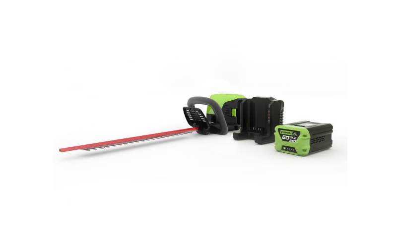 Greenworks Pro GD60HTK2 60V Cordless Hedge Trimmer The GreenWorks Pro 60 volt cordless hedge trimmer hands you all the power you need with up to 60 minutes of run time on a fully charged 2.0Ah battery. GreenWorks Tools are at the forefront of lithium-ion battery technology, with faster charge times, longer run times, less weight, reduced noise, no messy fuel, zero emissions, no cables and no maintenance. The DigiPro motor is fired up with an instant push button start.