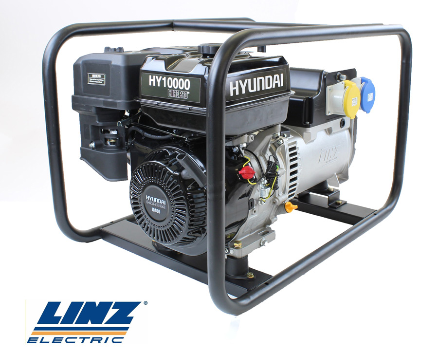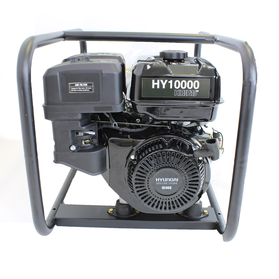 Hyundai HY10000 Hire Pro Petrol Generator 8Kw. This new model from Hyundai is a powerful open frame generator that is designed for commercial, home diy or leisure use and is powered by an efficient and economical 460cc / 16hp single-cylinder Hyundai 4-Stroke engine.