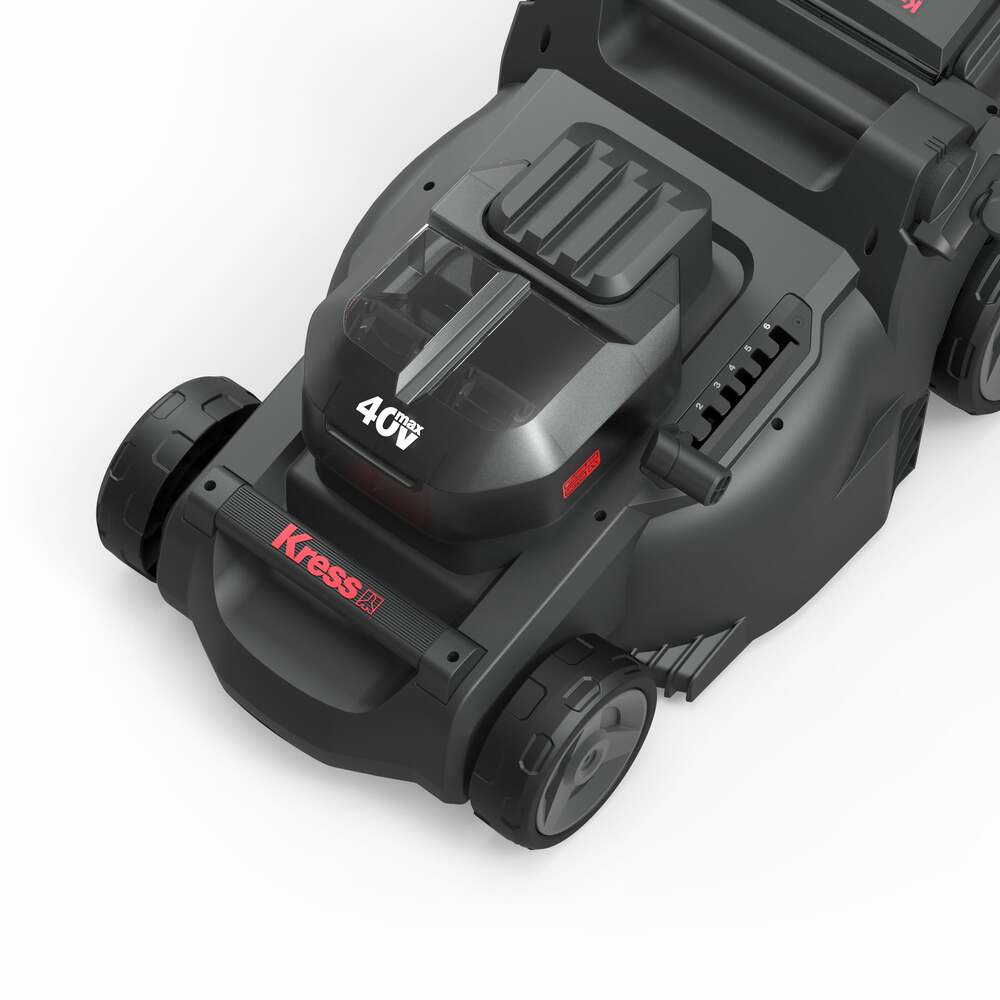 Other features include an ergonomic handle, quick-release folding mechanism for compact storage, single-lever cutting height adjustment, and the KrossPack battery compatibility, interchangeable with all 20V and 40V Kress tools..