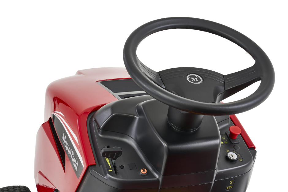 The cutting height can be adjusted to 7 positions (from 25 to 80 mm) using a lever next to the driving seat, whilst the blades are activated by an electromagnetic clutch at the touch of a button. A Mountfield Ergonomic steering wheel works with a Mountfield Classic adjustable high-back seat to make it a delight to drive.