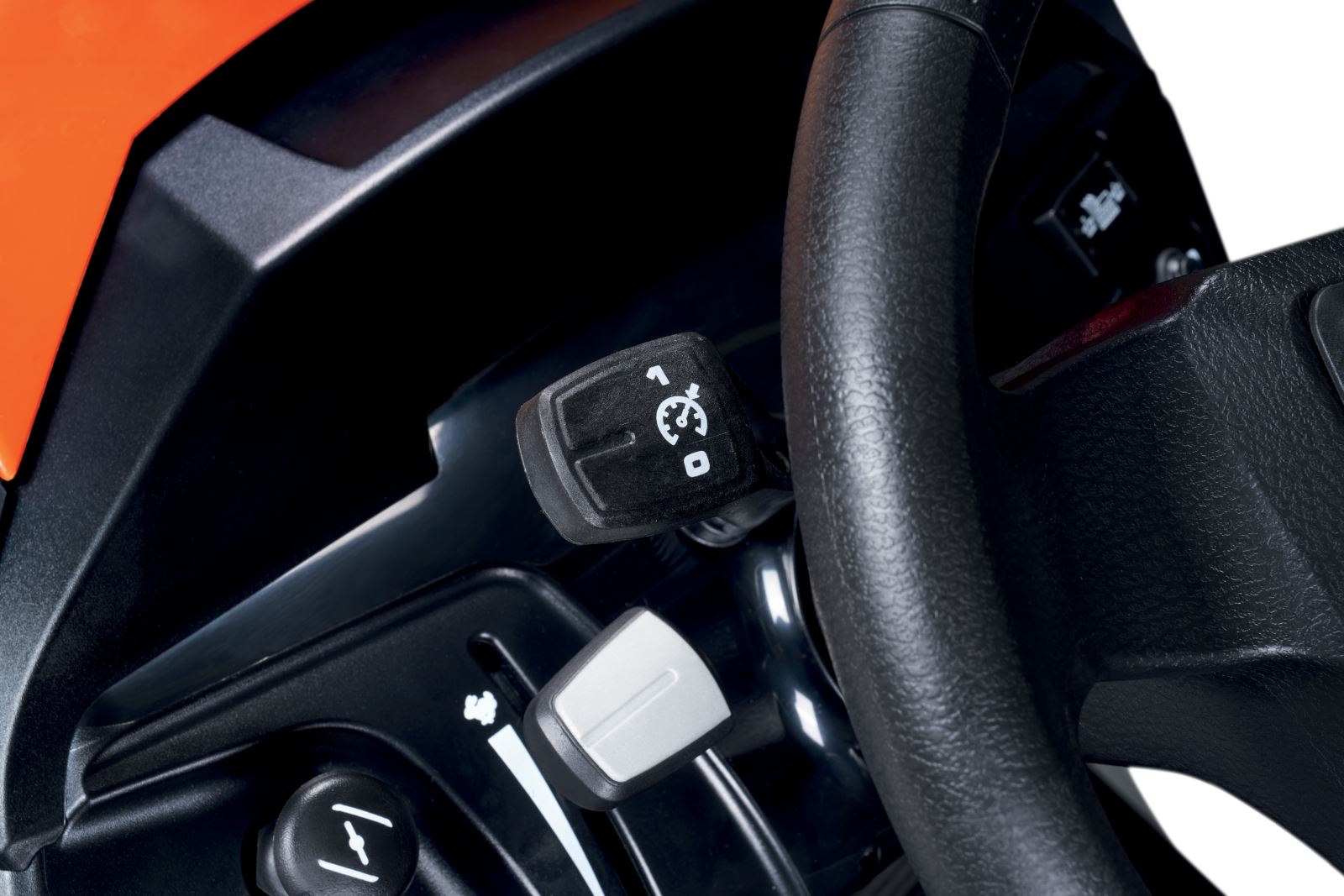 Compact dashboard with clear, easy-to-read instruments. The electronic display shows a range of useful information, including battery charge level, fuel level, blade operation and grass catcher open indicator.