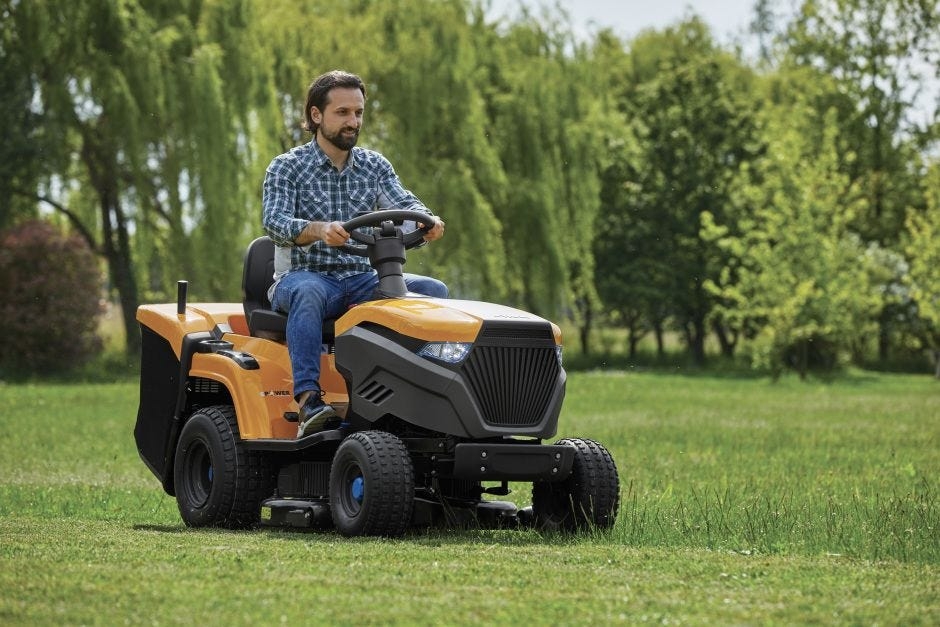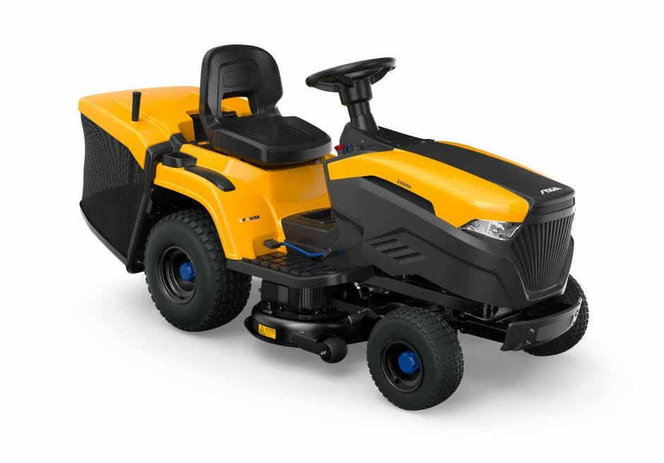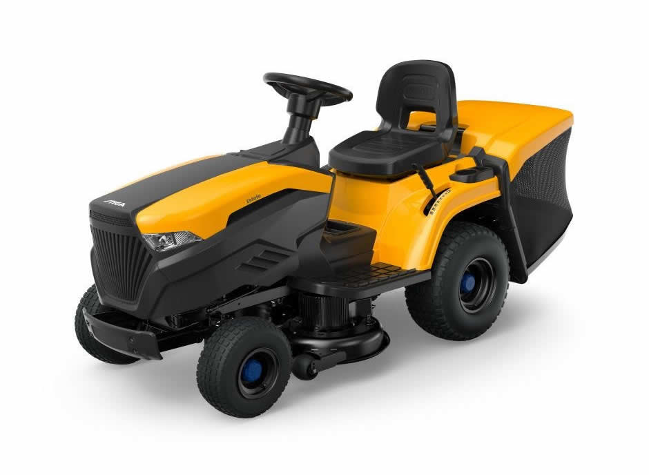 Stiga Estate 384e Lawn Tractor The Estate 384e 's 48V 30Ah battery combines the comfort of a sit-on lawn motor with the power of a petrol lawn tractor. And because the battery's so powerful and durable, you'll enjoy rides lasting up to 45 minutes, covering up to 1800sqm on one charge.