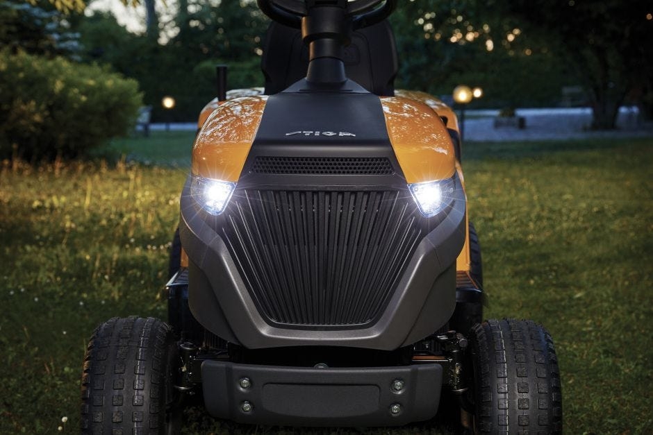 Thanks to a Bluetooth module, the machine can easily connect to the STIGA.GO App on your phone, which can both work as a dashboard and give you at-a-glance information on your mowing session, and it also features readouts on previous sessions, CO2 saved, maintenance activities, smart charge fucntion. Through the app you can also contact your local dealer directly, for quicker assistance. To increase runtime, an eco mode reduces blade rotations in light cutting conditions. And for an easy ride even in poor light, the Estate 584e's LED headlights illuminate all in your path. As a ride on mulching lawn mower, the Estate 584e will finely shred and spread grass cuttings to naturally fertilise your lawn. And thanks to its broad 98cm cutting width, adjustable to 7 heights between 25 to 80mm, the Estate 584e will tackle your lawn rapidly.