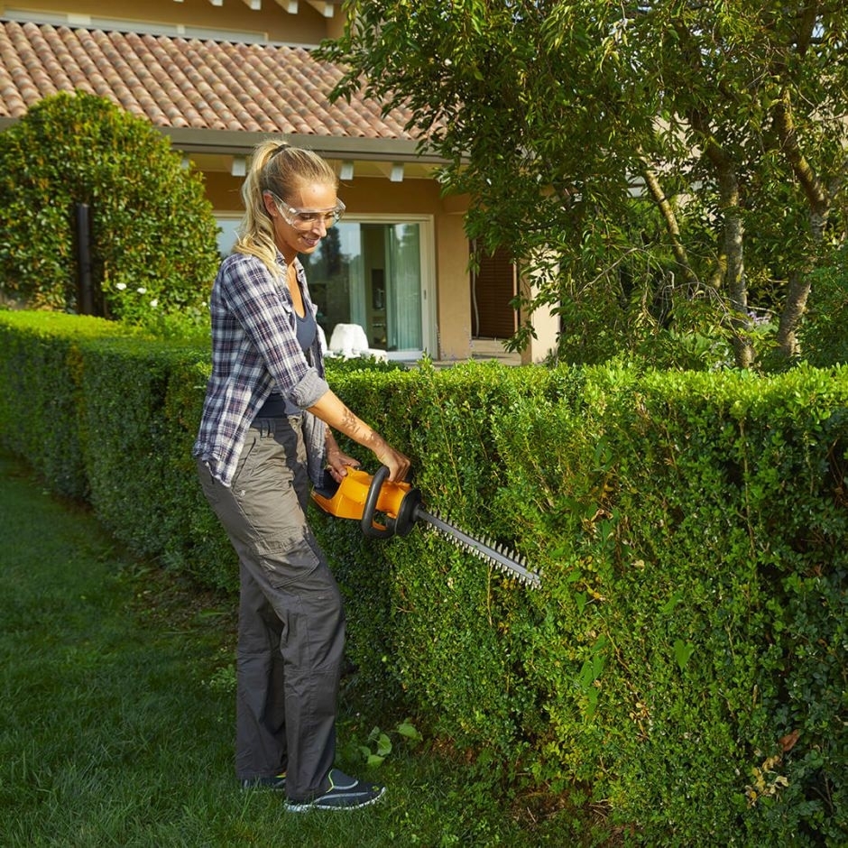 The HT 100e Kit (with battery 2,0 Ah) is a cordless hedge trimmer that makes light work of tough gardening jobs. With no trailing cables to get in the way, youre free to let the hardened steel 55 cm long dual-action blade get cutting trimming hedges and bushes with effortless precision.