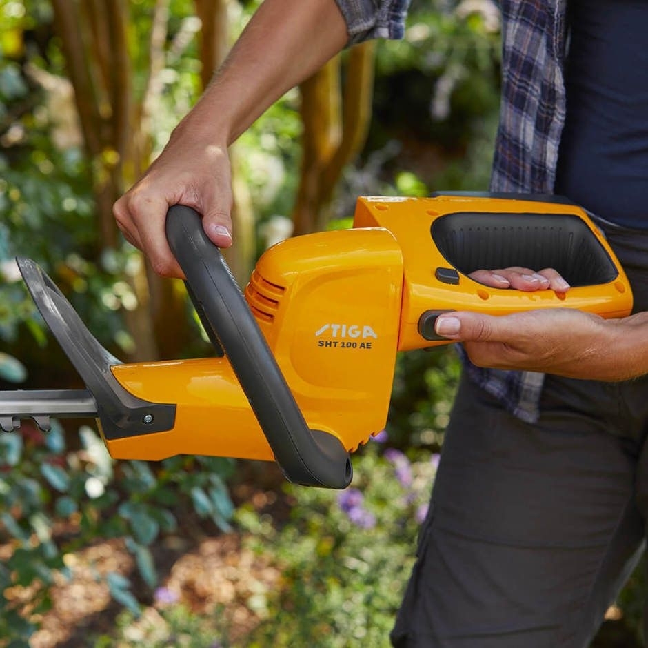 Stiga Essential HT100e Kit - Cordless Hedge Trimmer Powerful, precise and safe, this cordless hedge trimmer will get your garden into shape quickly and easily. Equipped with an ePower20V 2Ah battery developed and tested by STIGA in Italy it provides 40 minutes of non-stop cutting on a single charge. While the hardened steel blade with its 18mm spaced teeth cuts through bushes and branches from every angle with ease.
