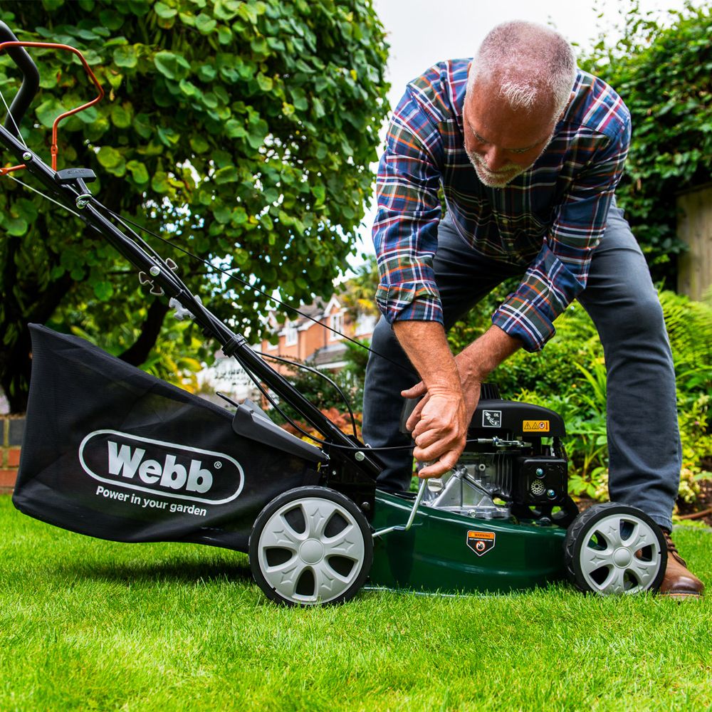 The Webb 410SP Classic Petrol Self Propelled Rotary Lawnmower Webb bring their high quality craftsmanship to rotary mowers for those who prefer the flexibility of a rotary mower. This 2 in 1 Webb Mower is powered by a Webb 132cc DOHV Engine and can be set to rear discharge and collect. A single lever adjusts the height of cut through 7 settings from 25-75mm. The 45 litre Grass Collector can handle large jobs while the mesh bag allows you to check when it needs emptying. The ergonomic SoftGrip handles can easily be folded for compact storage. The Self Proppelled feature means easier cutting.