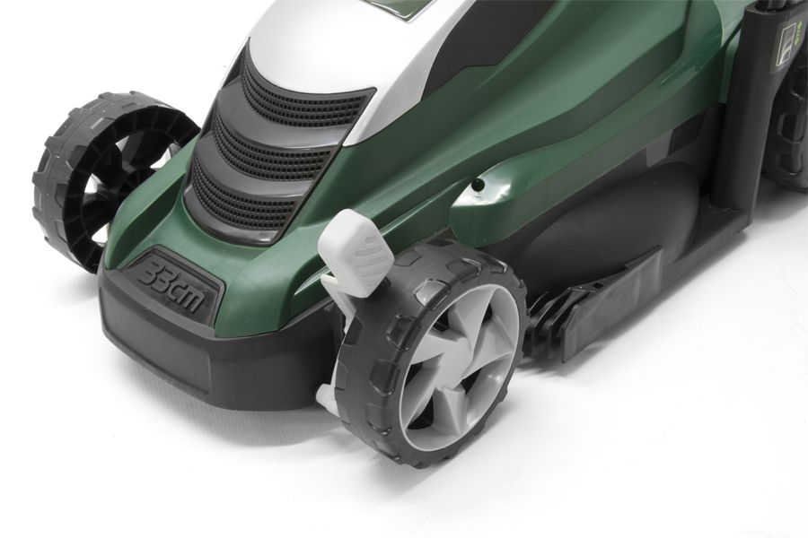 Webb ER33 Electric Lawnmower 1300W 33cm Cut. This new Webb model has a 33cm (13 inch) cutting width and a powerful 1300 watt motor. This hand propelled lawn mower is lightweight, easy to use and perfect for the small to medium sized garden. The Webb ER33 has a tough plastic cutter deck with a single lever 5 position (25mm-65mm) cutting height adjustment for a quick change, also benefitting from folding handles and a 35 litre grassbox. This lawnmower is easy to move around thanks to it's integrated carry handle.