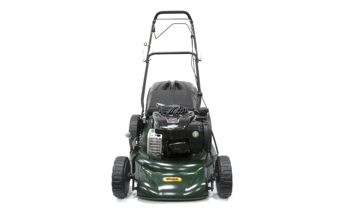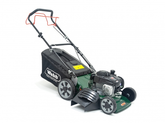 The Webb R18HW4 4 in 1 Petrol Self Propelled Lawnmower The 18 4 in 1 Webb Mower is self propelled by Briggs & Stratton 500e series engine and can be set to collect, mulch, rear or side discharge. A single lever adjusts the height of cut through 7 settings from 20-90mm. The 65 litre grass collector can handle larger jobs while the Easi-View feature allows you to check when it needs emptying. The ergonomic SoftGrip handles can easily be folded for compact storage.